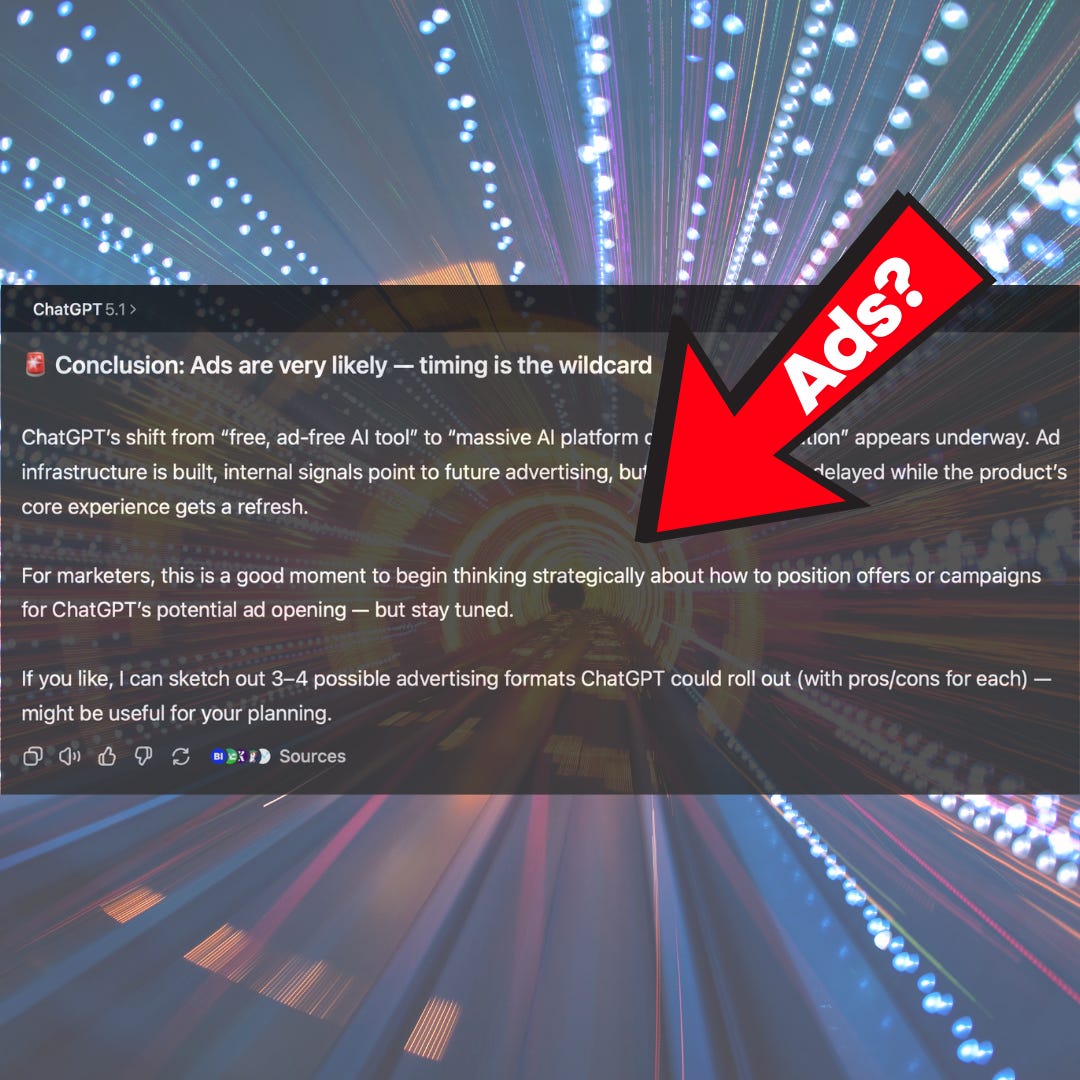 ChatGPT ➔ ChatGPT is preparing ad placement inside conversation flows. The early goal appears to be subtle insertion that supports the natural back and forth instead of interrupting chats. I predict we can expect ads to appear when users move from exploration to evaluation (mid-funnel).